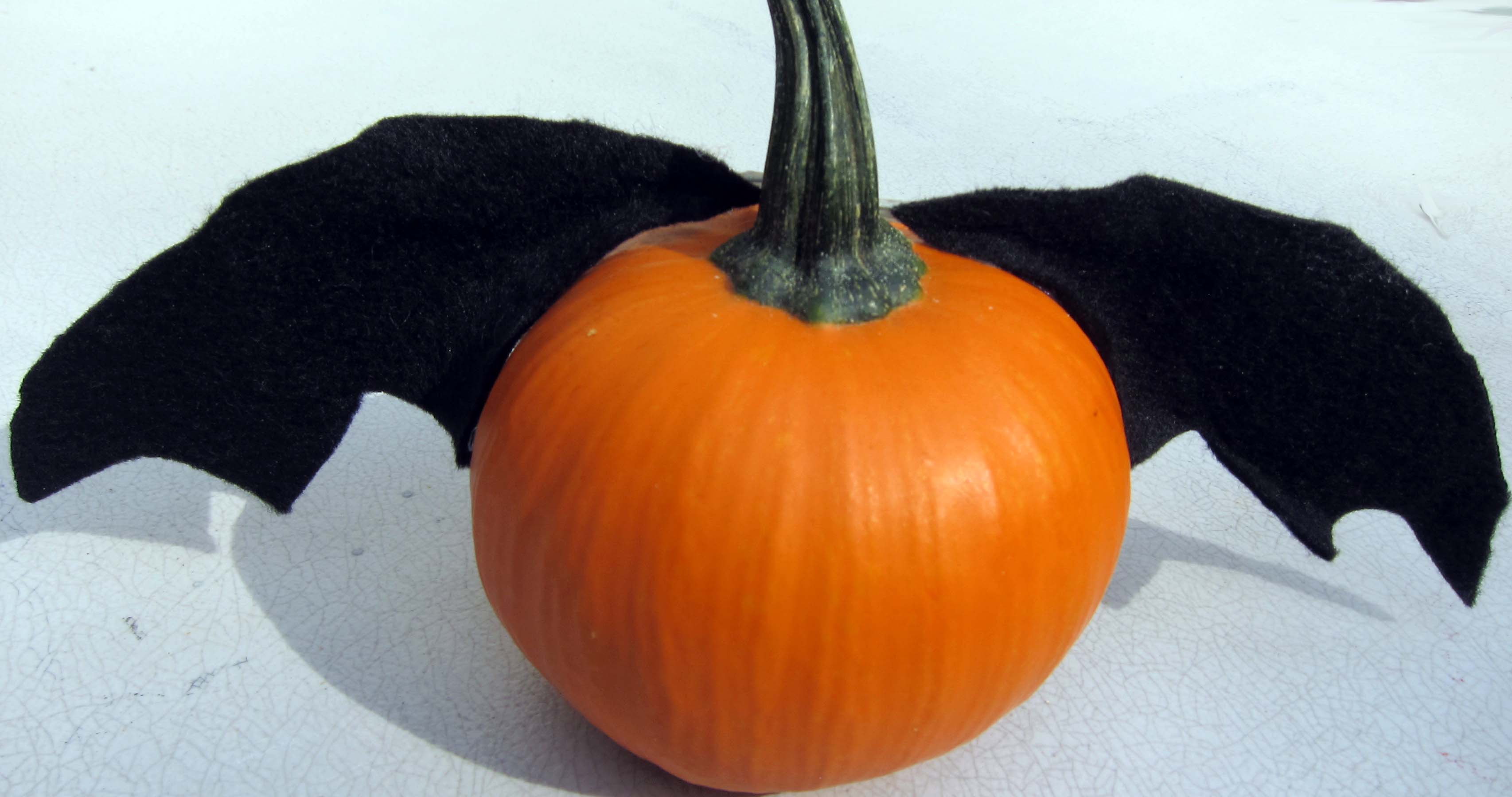 Cut bat wings out of scraps of felt or old fabric. Use a glue gun to secure to the pumpkin. You can stiffen the fabric with starch or paint on white glue and leave to dry. Hang this pumpkin from fishing line for added effect.
