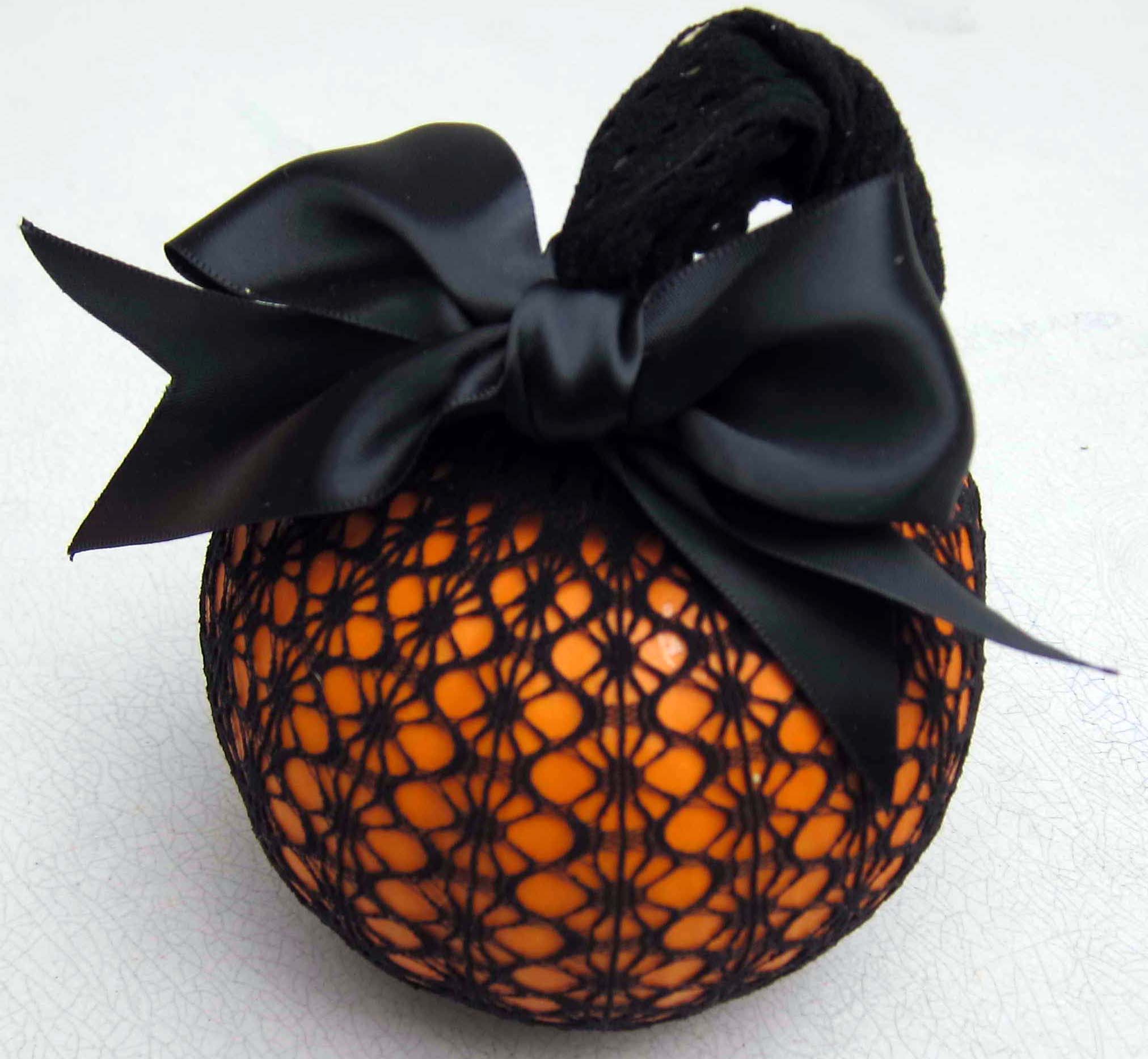 This sassy Halloween pumpkin is easy to make and looks really posh. Push pumpkin down to the toe end of a old pair of fishnet leggings. Tie a knot in the top, cut with a scissors and secure with a ribbon.