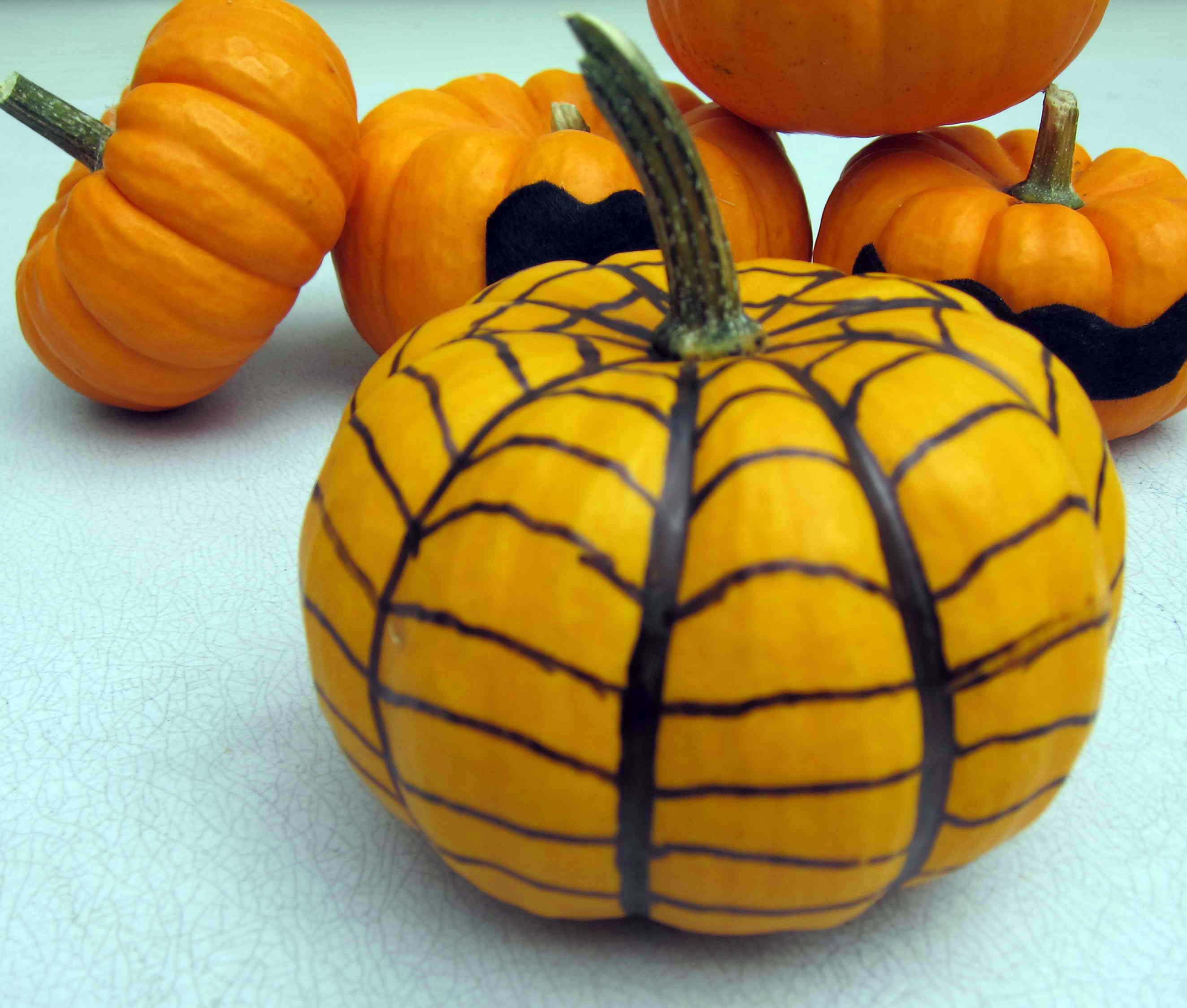 Use a black marker to draw designs onto your Halloween pumpkins. You can also use left over black paint. Make stencils by printing shapes onto used cardboard and cutting them out. Hold the cardboard cutouts against the side of the pumpkin and paint over them. Select pumpkins with flat sides for best results.