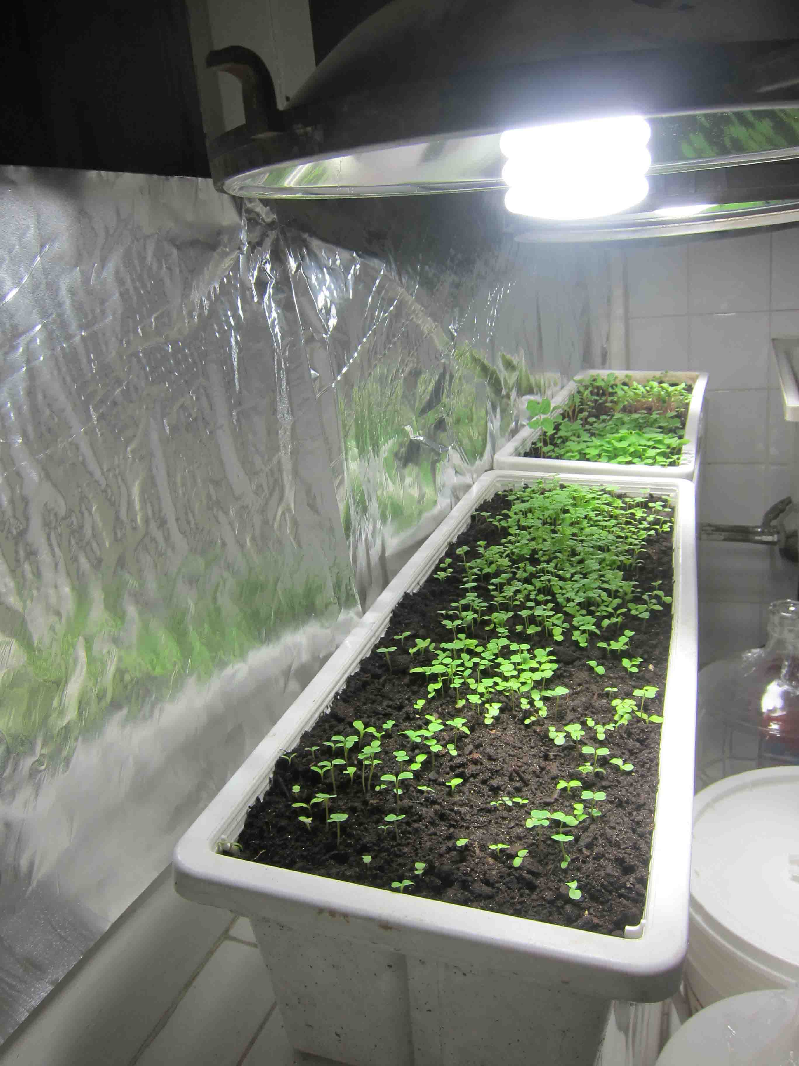We simply wired the hoods together and popped in the light bulbs. We turned the hooks into the wall and hung the hoods with string so that we can adjust the height of the lights as the plants grow. The three lights cost approximately $3.00 a month to run for ten hours a day. The entire assembly cost $15.00. You can substitute foil for the light hoods if you can’t find recycled ones.