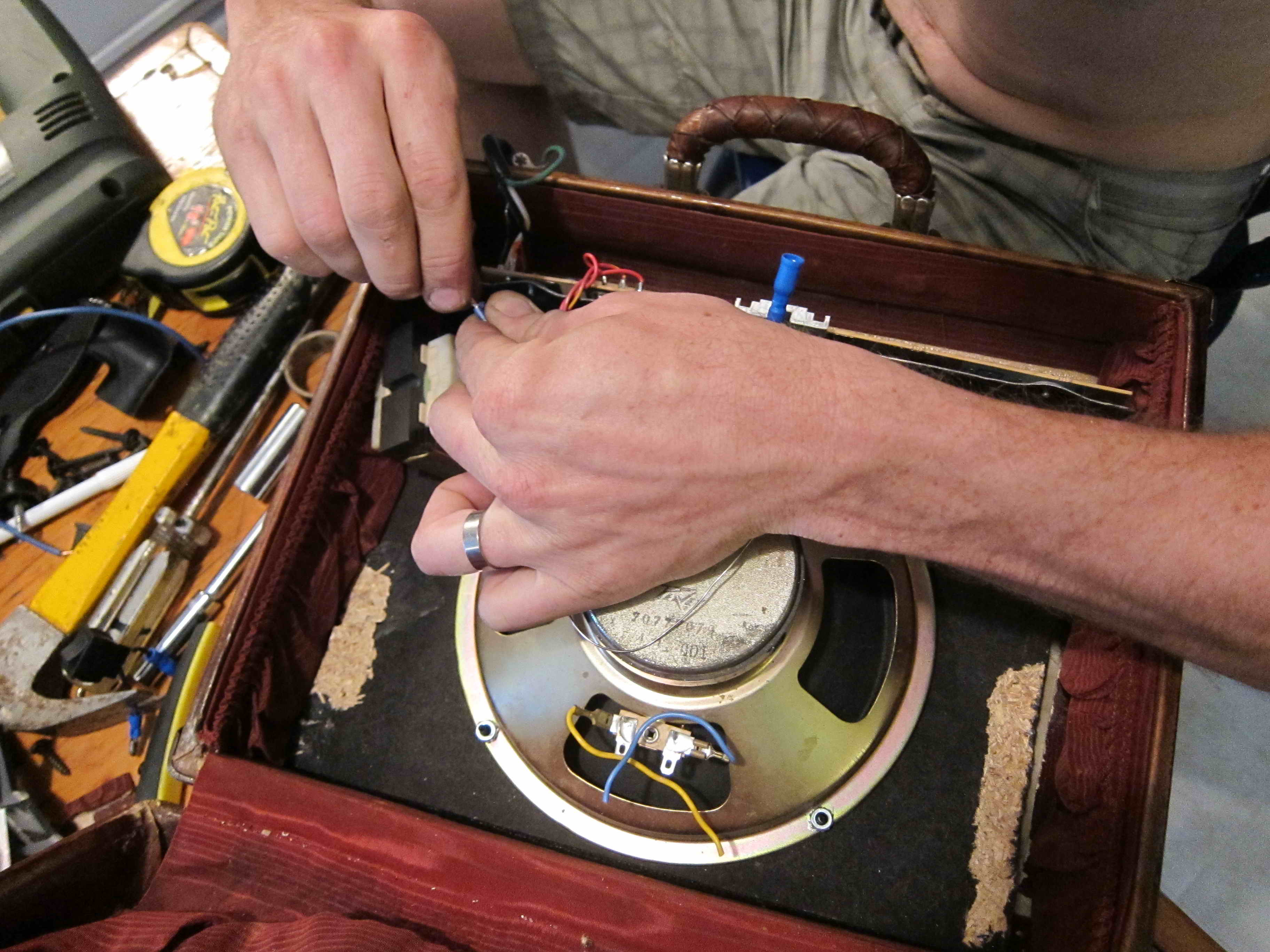 Find a position for the speaker and controls that suit your suitcase (see what we did there?) Trace around both of these and set them aside. Drill a hole along the traced line and use the jigsaw to cut out a hole for your speaker and another one for your control panel. Fasten the control panel to the wooden panel that the speaker is mounted to with some screws. Fit it into the hole that you cut into the suitcase and fasten the assembly together by screwing through the suitcase and into the wooden panel.